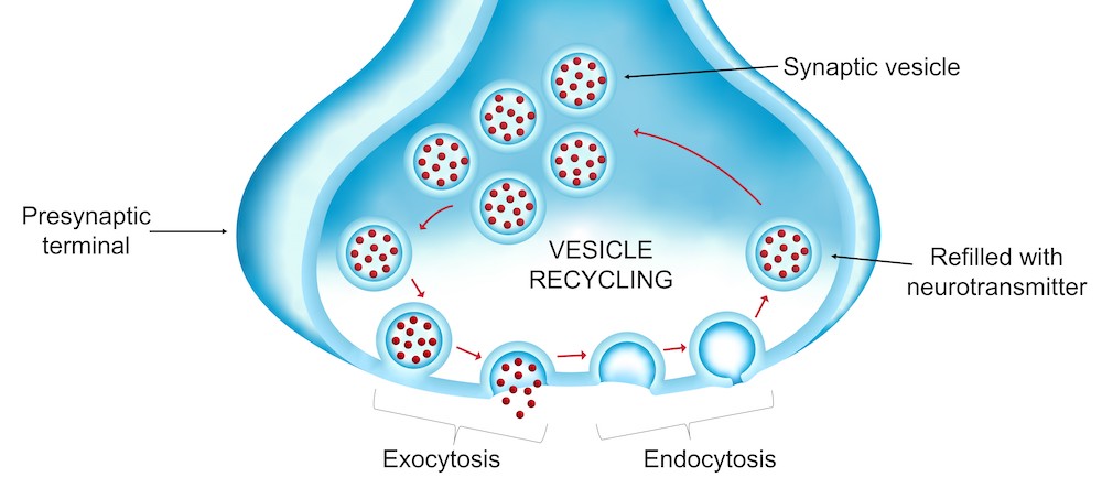 Vesicle recycling is a vital process for the release of neurotransmitters across the synapse since synaptic vesicles must fuse with the presynaptic terminal membrane, in a process called exocytosis.
